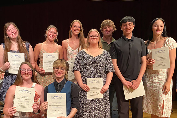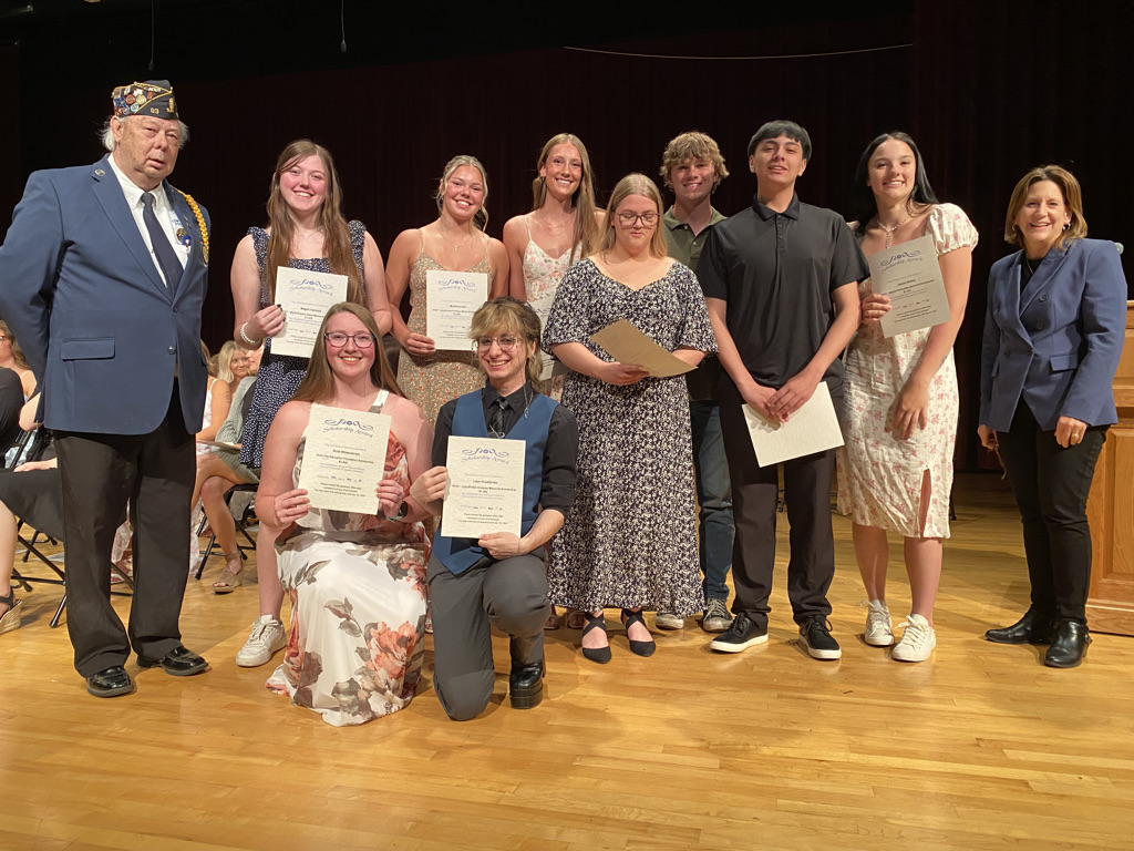 Scholarships were awarded at RCHS on May 19, 2025. Pictured here (l to r): Ruth Widenstrom, Liam Grodijendo (kneeling); Dennis Pederson, DaLyla Oberg, McKenna Garr, Autumn Stream, Maggie Schultz, Braden Niessen, Carlos Quito, Megan Vacinek and Kristin Papke.